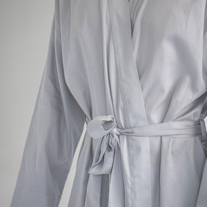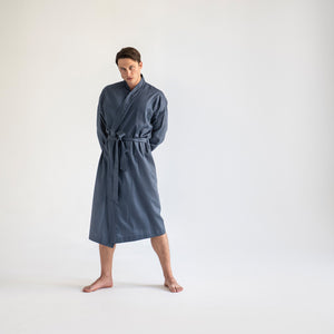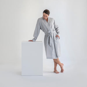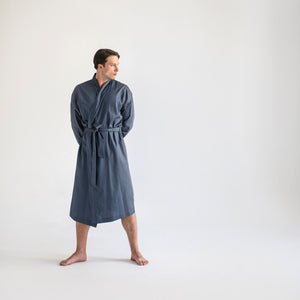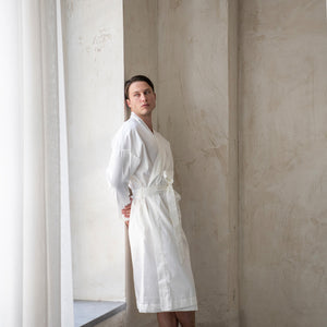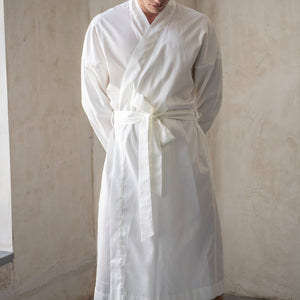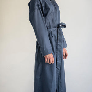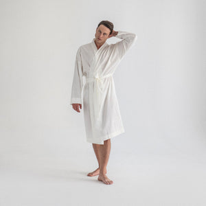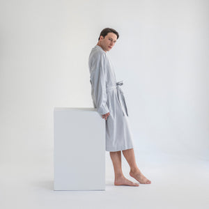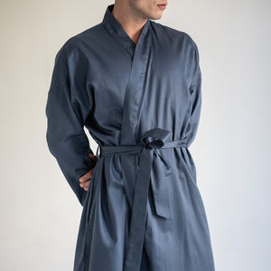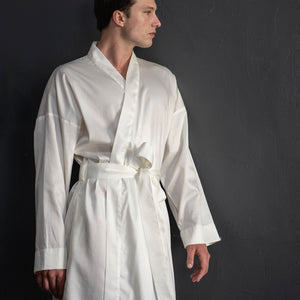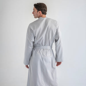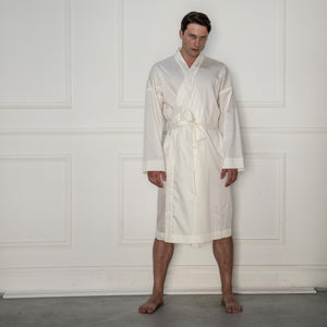 Muški bademantil od egipatskog giza saten pamuka, lagan i nenametljivo udoban. Glatko prijanja uz kožu, prozračan je i prijatan, za trenutke kada ti prija osećaj mekoće i udobnosti. Kroj je jednostavan i opušten, ležerno prati liniju tela, dok suptilan sjaj materijala diskretno otkriva njegovu izvrsnost. Prirodan, udoban i tihog luksuza, ovaj bademantil je tvoj svakodnevni sloj lakoće i stila.
